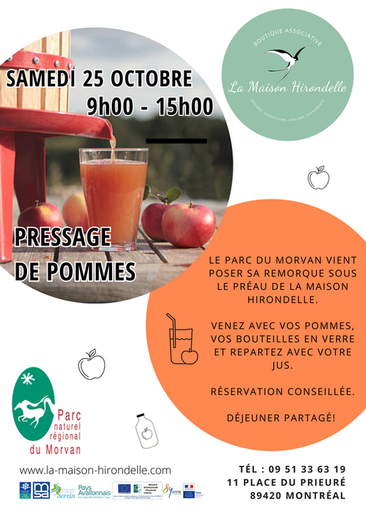 Le pressoir mobile du Parc Naturel du Morvan sera présent dans la cour de laMaison Hirondelle. De quoi faire de bonsjus avec les fruits de vos vergers.