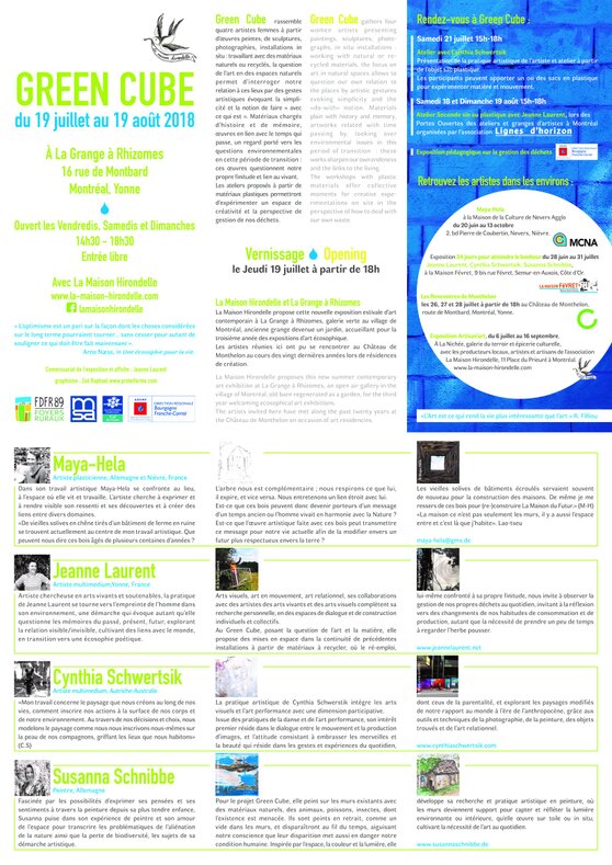 Au Green Cube, posant la question de l’art et la matière, elle propose des mises en espace dans la continuité de précédentes installations à partir de matériaux à recycler, où le ré-emploi, lui-même confronté à sa propre finitude, nous invite à observer la gestion de nos propres déchets au quotidien, invitant à la réflexion vers des changements de nos habitudes de consommation et de production, autant que la nécessité de prendre un peu de temps à regarder l’herbe pousser.